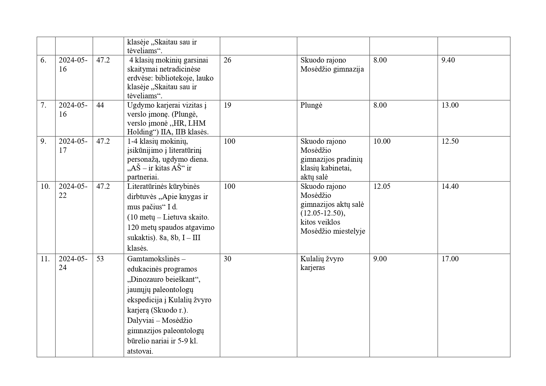 Įgyvendinant ,,Tūkstantmečio mokyklos II“ Skuodo r. sav. švietimo pažangos plano 47.2 veiklą, birželio 4 d. aktų salėje vyko netradicinė skaitymo pamoka, kurios metu 6 klasės mokiniai kūrybiškai pristatė perskaitytas knygas. Prieš tai pamokų metu jie skaitė įvairių žanrų tekstus, juos aptarė kartu su mokytoja. Tada pasiskirstę į 3 grupes rengė kūrinių inscenizacijas. Grupėms vadovavo „režisieriai“ Vitalijus S., Gabija C. Ir Auksė V. I grupė nuotaikingai suvaidino P. Cvirkos pasaką „Kupriukas muzikantas“. II grupė taip pat parengė vaidinimą – savaip interpretavo A. Liobytės pjesę-pasaką „Kuršiukas“. Abiejų pristatymų metu skambėjo pačių šeštokų atliekami muzikiniai intarpai. III grupė pasirinko kitokį kūrinio pristatymo būdą – sumontavo filmą pagal M. Vainilaičio eilėraštį „Kupriukas muzikantas“. Šeštokai nors ir labai jaudinosi, bet buvo patenkinti savo rezultatais ir norėtų, kad tokia diena taptų tradicija. Mokiniams tokia veikla skatina skaityti, atskleidžia kūrybiškumą, individualius gebėjimus, padeda formuoti bendravimo, bendradarbiavimo, mentorystės įgūdžius, padeda nugalėti scenos baimę.